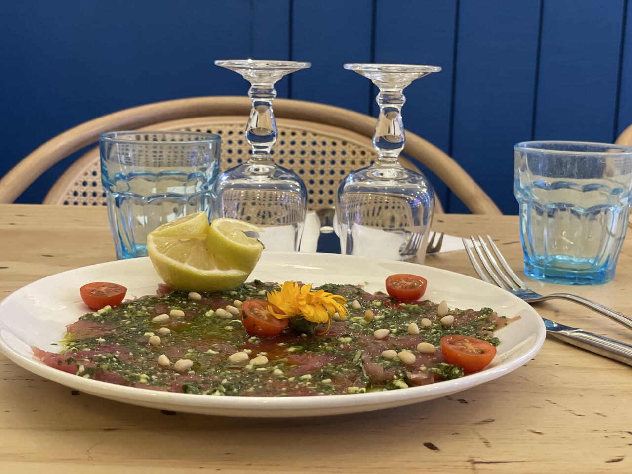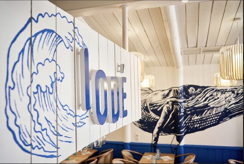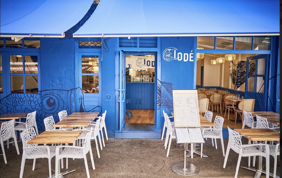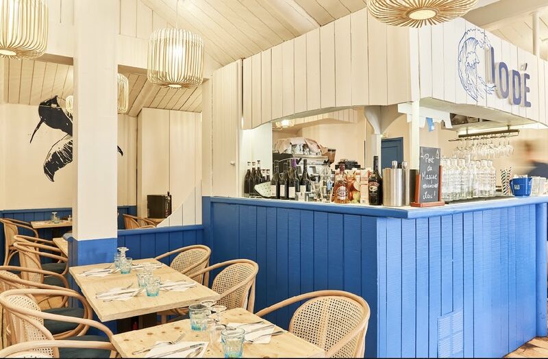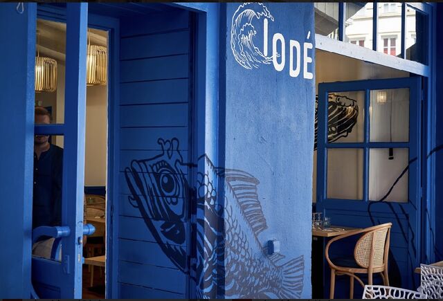 Tout en bleu et blanc, dans la Presqu'ïle de Lyon, le restaurant Iode propose une évasion marine avec ses majestueuses baleines, sa tortue géante et son poulpe dessinés des murs au plafond. Le mobilier en bois clair offre un caractère dépaysant à cette adresse qui invite au voyage. Aux beaux jours, on s'installe en terrasse, pour des moments chaleureux dans la rue piétonne des Marronniers, aux airs de vacances.